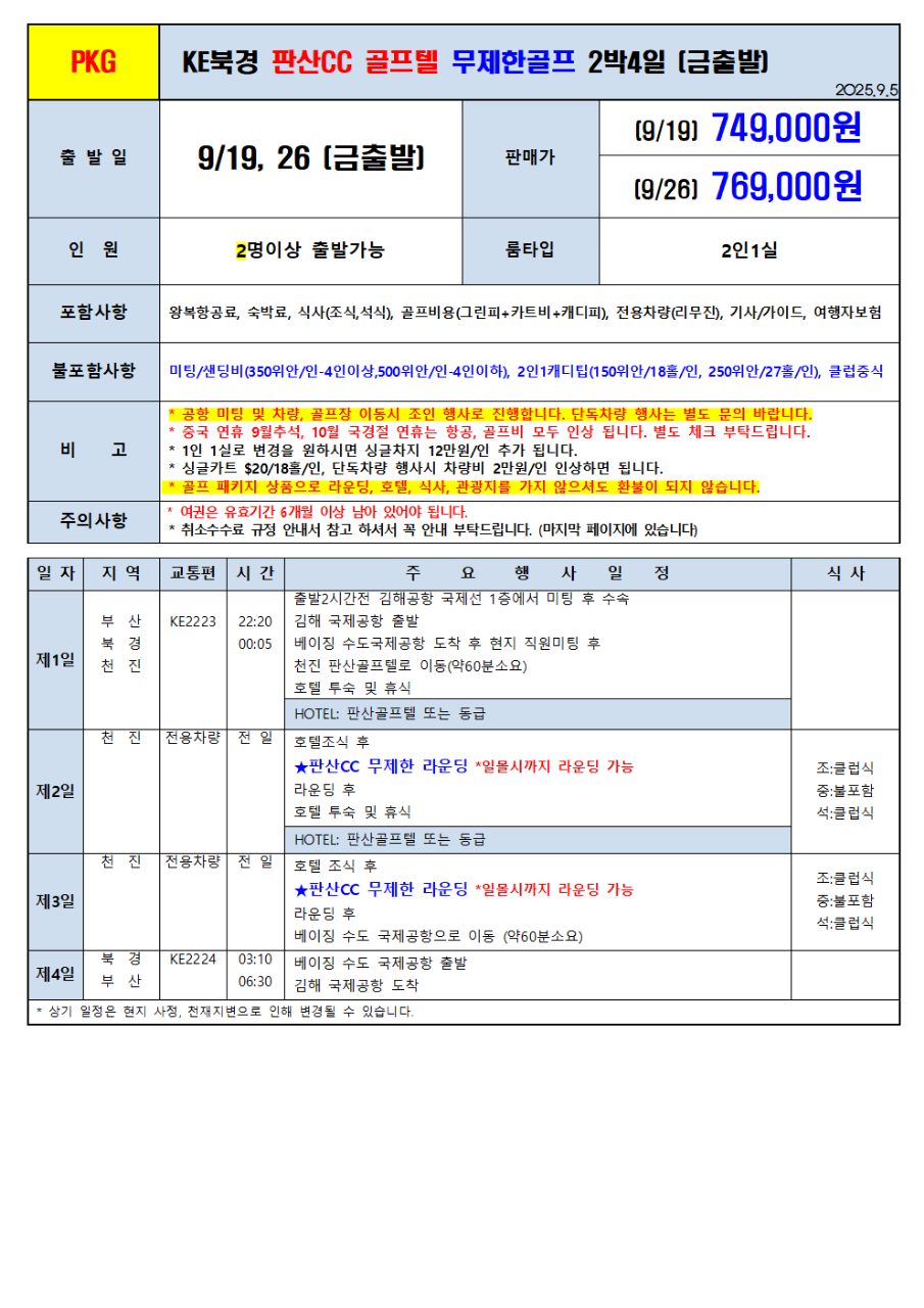 ⭐ 대한항공 북경 천진 골프패키지 - 부산출발 매일 운항 ⭐